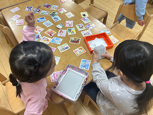 牛乳パックやペットボトルのキャップを使って作った”こま”で遊んだり、カルタをお友達同士で楽しんだりと賑やかに過ごしています🌱